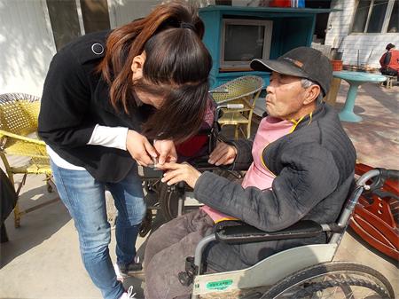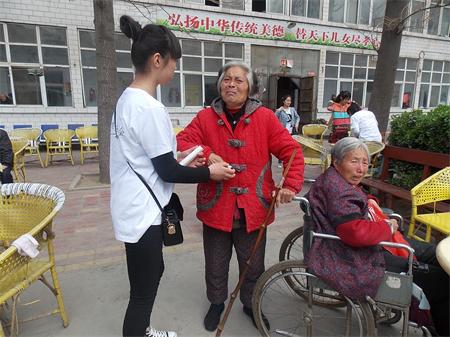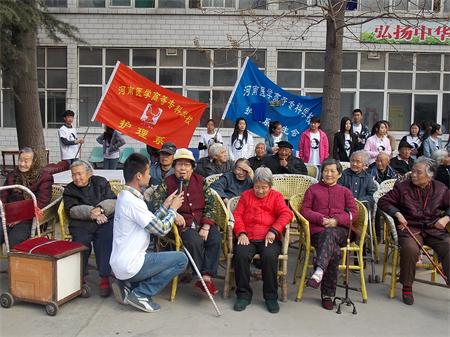在没见到这些爷爷奶奶之前,志愿者有点紧张,怕交流有障碍。但当看到爷爷奶奶慈祥的笑容时,心里的石头也落下了。首先,同学们小心翼翼地搀扶老人到庭院中晒太阳。接着,他们为爷爷奶奶唱歌、跳舞、唱戏。老人随着同学的表演津津有味的敲打节拍,乐不拢口。在轻松愉快的氛围中看到了老人脸上洋溢的开心与幸福。节目过后同学们为老人们量了血压,有一些细心的同学在陪老人聊天当中还为他们按摩,剪指甲。看着年迈孤独的老人们,同学们还是难以抑制心中的心酸。离开时,老人们紧紧地握着同学们的手,依依不舍的与同学们拥抱告别。