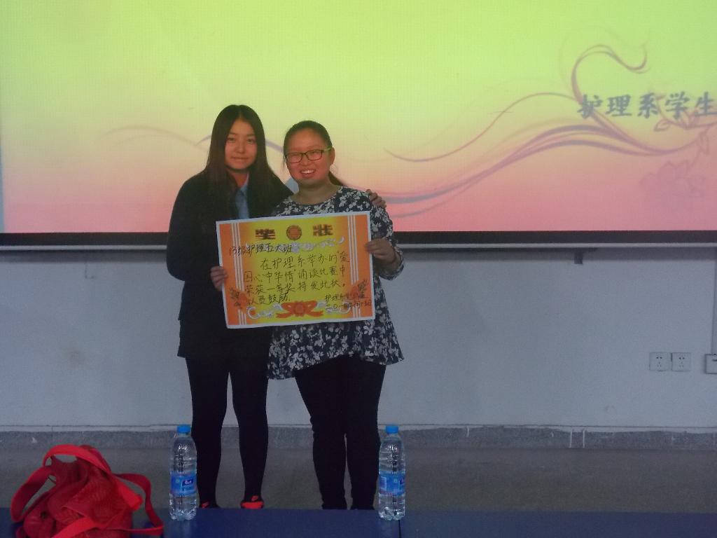 为增强我校学生与时俱进的时代精神,展现当代大学生的爱国主义情怀,我护理系特于2014年10月15日举行了以“爱国心,中华情”为主题的诵读比赛,此次活动由护理系党总支主办、护理系学生会组织部承办。