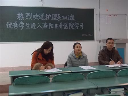 2014年3月6日中午12:30分于教学一区307教室举行了一场欢送护理系2012级优秀学生进入洛阳正骨医院学习的仪式。护理系副主任王银燕、护理系党总支副书记张长辉、护理系辅导员代表王敏老师及优秀学生代表参加了本次欢送仪式。