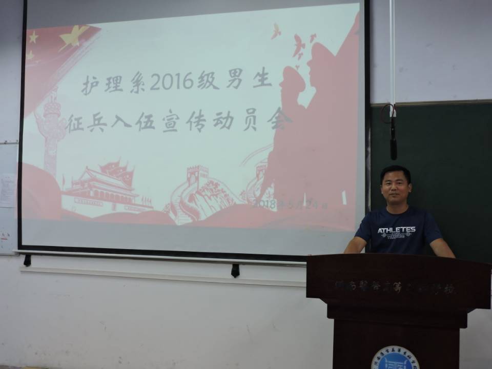 为激励护理系男生踊跃参兵,为保卫祖国奉献自己的一份力量。2018年5月24日下午3~4点,护理系分别于教学一区109和一区302为护理系全体男生进行征兵宣传,本次动员会到场的有护理系团总支副书记张华龙,护理系学生第一党支部书记王敏,护理系辅导员袁彬、葛艳莉、潘颖、王茜冉、黄瑞、王辉、夏高鹏,特邀护理系士官生辅导员覃小波就本次征兵号召进行宣讲。
