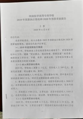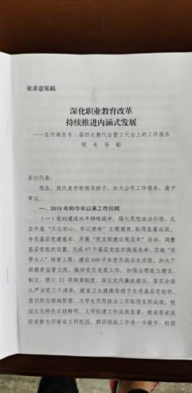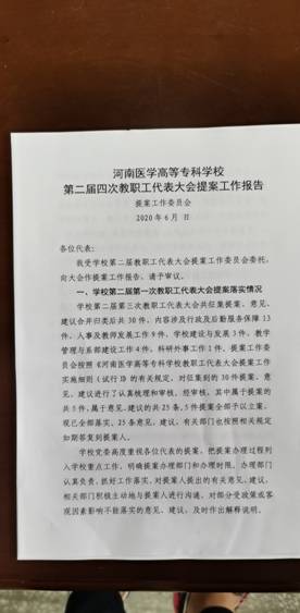 会议先后审议通过了由提案工作委员会提案的太阳成集团第二届四次教职工代表大会提案工作报告、校长孙韬关于“深化职业教育改革,持续推进内涵式发展”在河南医专二届四次教代会暨工代会上的工作报告和副校长王黎的2019年预算执行情况和2020年预算草案报告。
